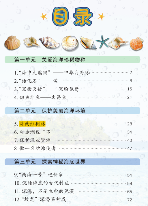 描述 :本套教材共分五册:小学阶段低、中、高年级各一册,中学阶段初中、高中各一册。在小学分册,同学们可以结识千奇百怪的海洋“居民”,感受变幻莫测的海洋性格,游览风光无限的海岛、极地……通过逐渐感知海洋,萌生对海洋的情感。